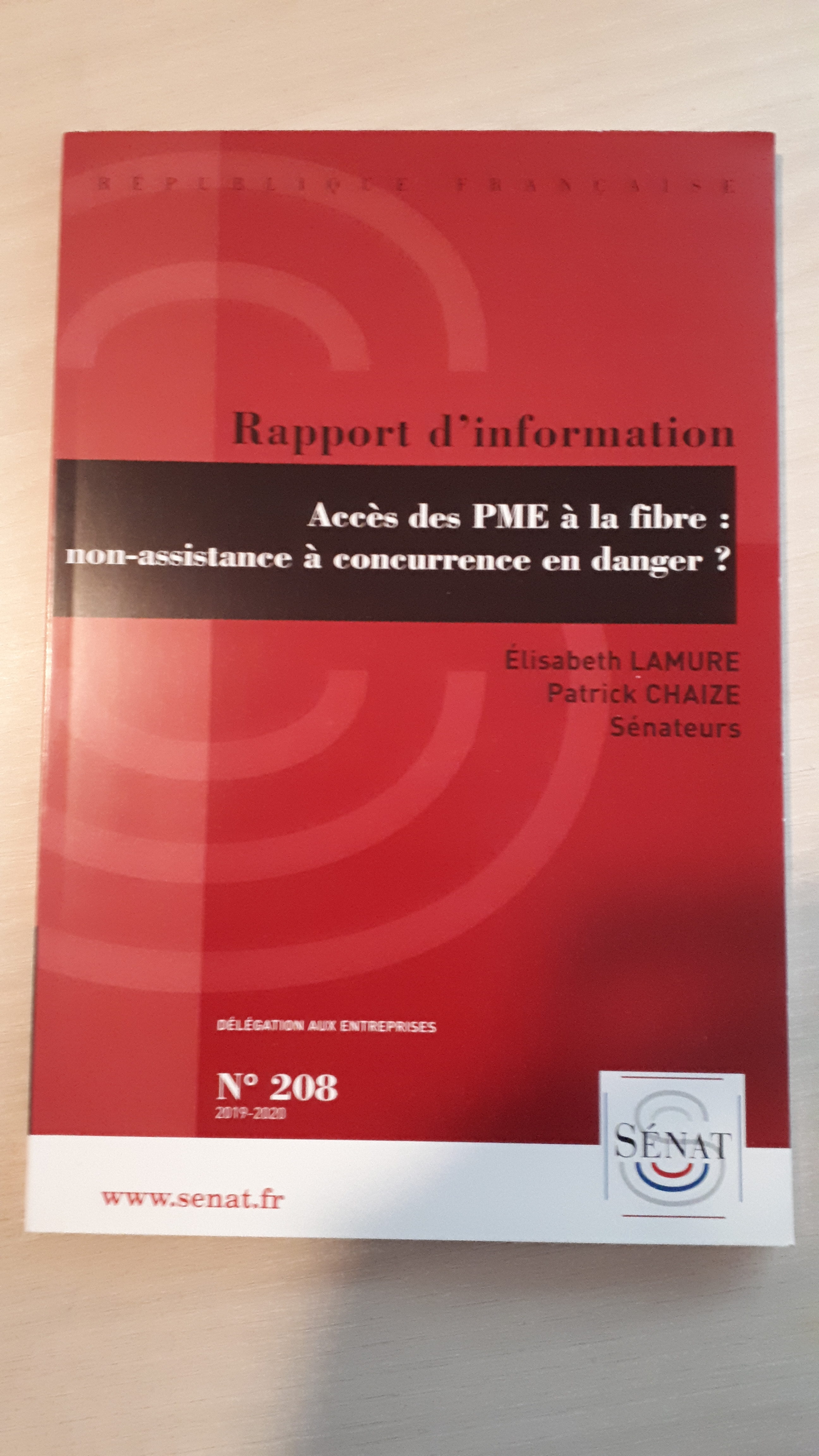 "Accès des PME à la fibre : non-assistance à concurrence en danger" réalisé avec ma collègue Elisabeth LAMURE, au nom de la délégation aux entreprises.
