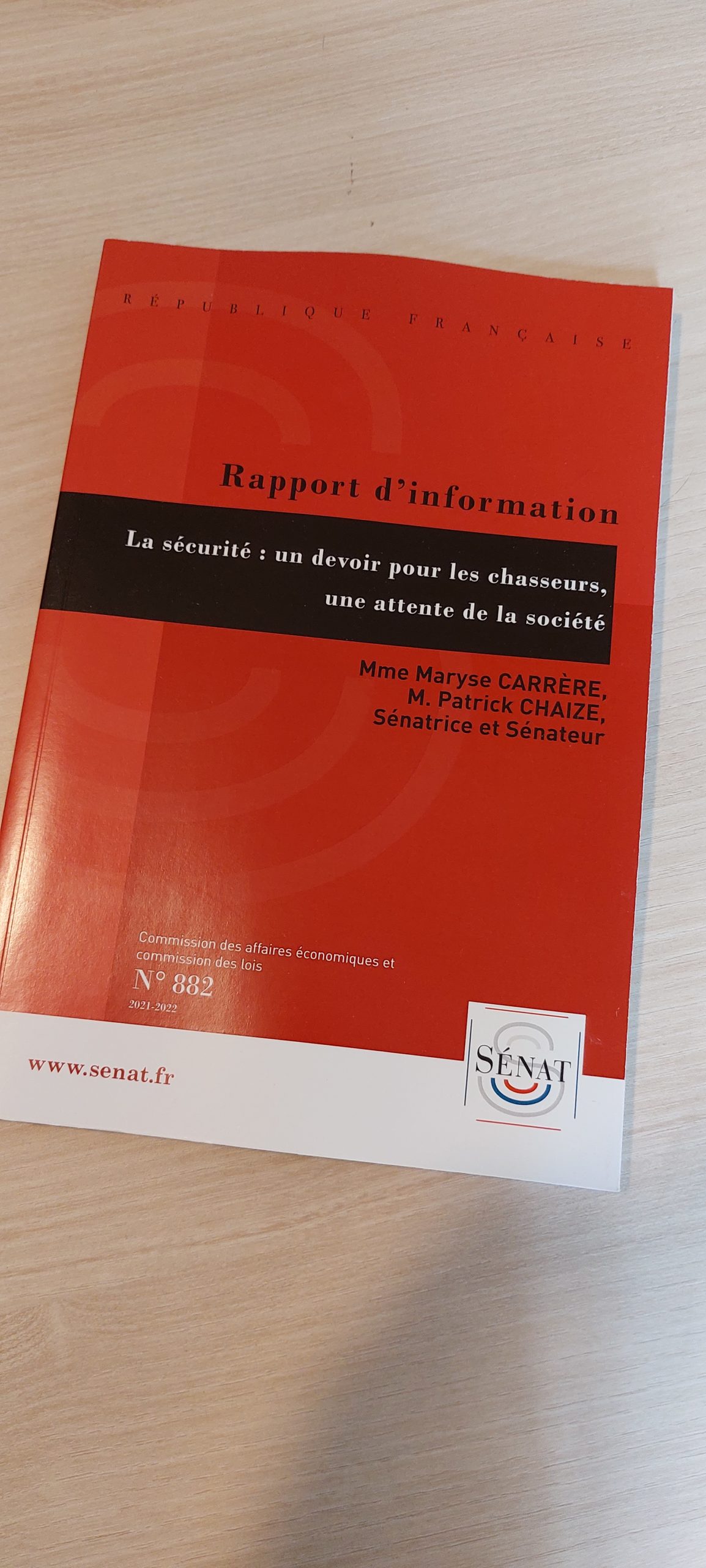 Un neuvième rapport d'information (n° 882 - septembre 2022) intitulé "La sécurité : un devoir pour les chasseurs, une attente de la société" réalisé avec ma collègue Maryse CARRERE, au nom de la commission des affaires économiques et de la commission des lois constitutionnelles, de la législation, du suffrage universel, du Règlement et d'administration générale par la mission conjointe de contrôle sur la sécurisation de la chasse.